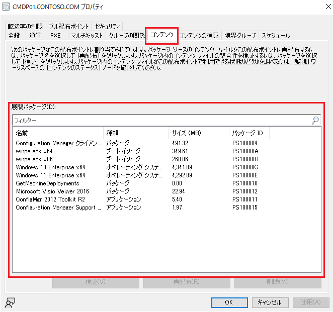 Configuration Manager コンソールから確認いただく場合には、配布ポイントのプロパティより展開されているコンテンツを確認します。