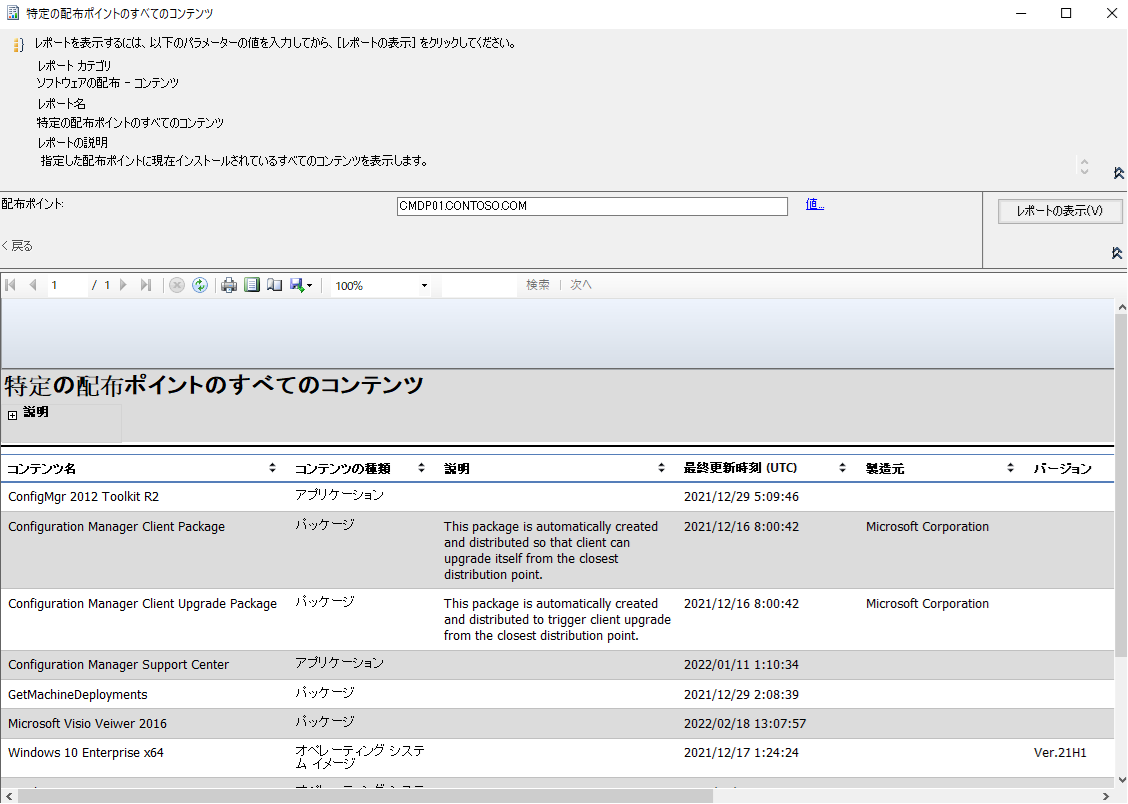 - [特定の配布ポイントのすべてのコンテンツ] レポートより、確認した配布ポイントを検索条件に入力し、[レポートの表示] をクリックします。