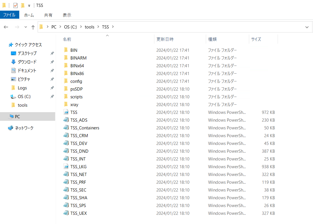 採取した資料が 標準では以下のように [出力フォルダ指定先]\TSS_[ホスト名]YYMMdd-HHmmss というフォルダ配下に作成されますので、フォルダをアーカイブ化して弊社までお寄せください。