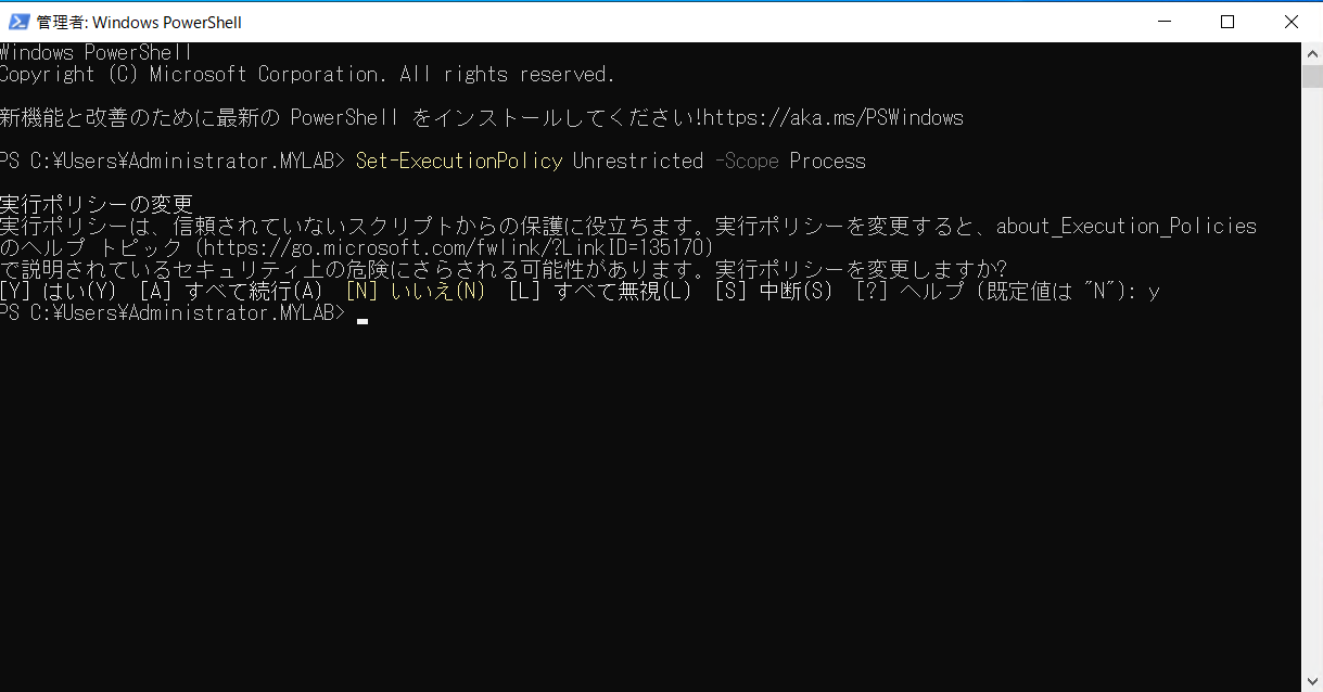 起動した PowerShell コンソールで以下のコマンドを実行し、PowerShell スクリプトを実行できるように、実行ポリシーを変更します。なお、本実行ポリシーは開いた Powershell コンソール内のみで有効となります。