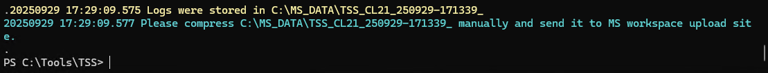 “Please compress [フォルダ名] manually and send it to MS workspace upload site.” と表示され、Powershell ウィンドウの操作が戻ってきたら収集完了です。